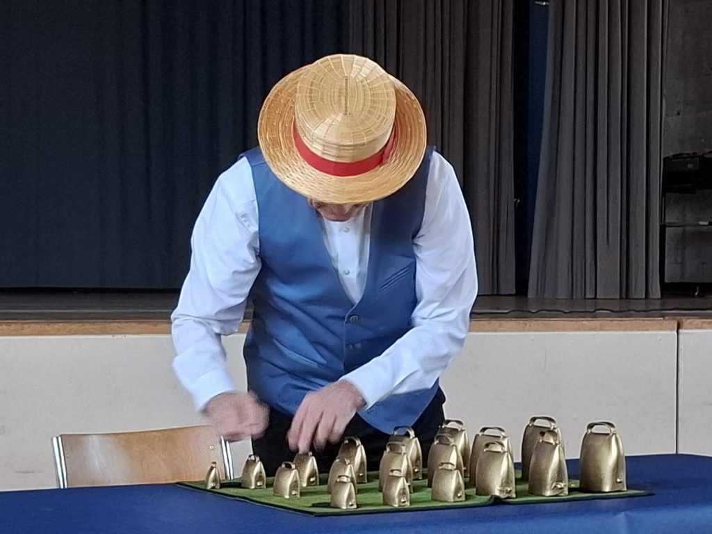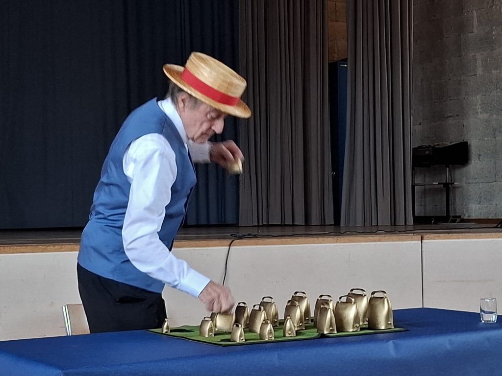 Humor, nachdenkliche Sprüche und viele herrlich-bekannte Melodien von damals. Das war im Repertoire von Jean Luc Oberleitner, als er in Uttwil am Seniorennachmittag am 8. Januar auftrat. Damit gewann er sein Publikum, das teils sogar mit in den Gesang einstimmte. Als spezielle Attraktion dann noch sein Glockenspiel am Schluss seiner Darbietung. Das zog im Anschluss grad Neugierige nach vorn und ins Gespräch mit unserem Gast.